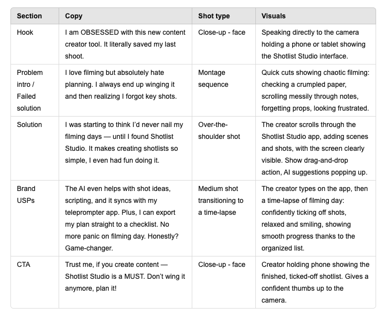 A shot list outlines the visuals that will accompany your script – including b-roll and talking-to-camera clips.